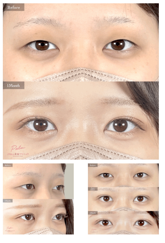 この患者様の場合、まぶたの数カ所を糸で結び、二重を作っています。手術後の写真の通り、二重ラインを作ることで瞳も大きく見えるようになりました。