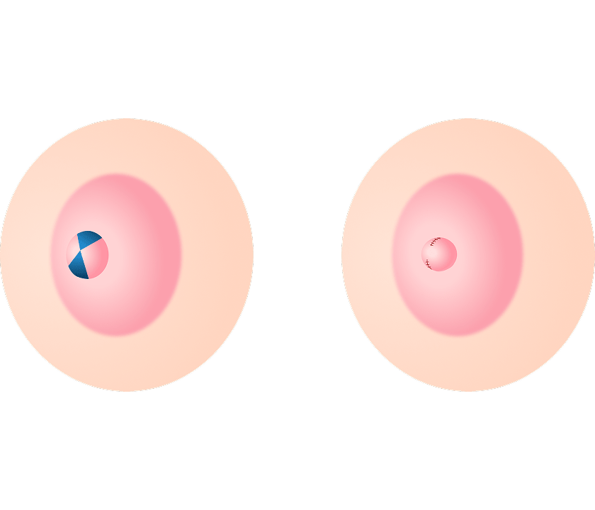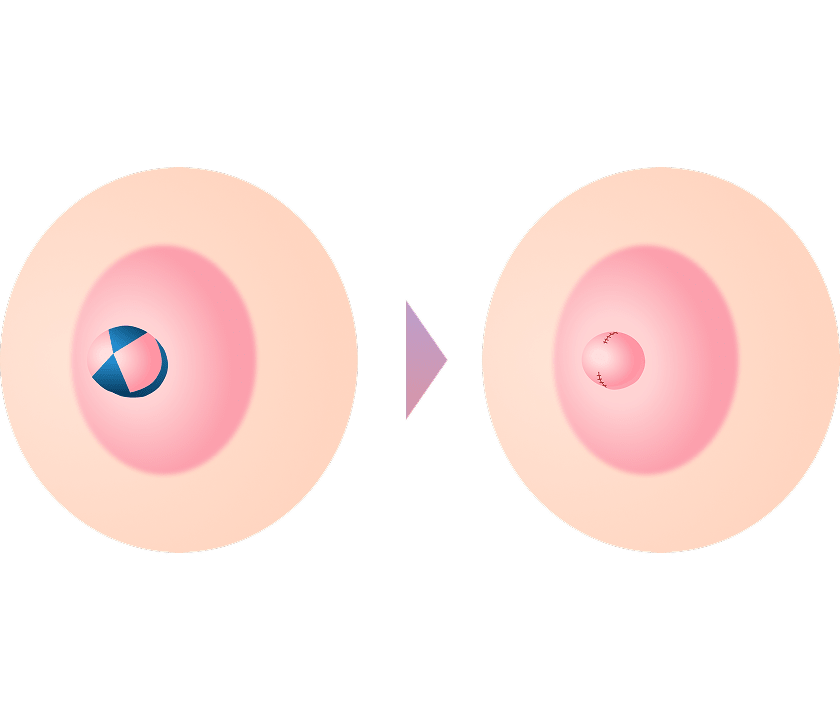 乳頭の根元部分をドーナツ状に切除し、縫合する高さを低くする術式(乳管温存法)、もしくはケーキをカットするように乳頭を三角形に切除し、縫合する直径を小さくする術式で手術を行います。これらの術式を合わせて高さを低く直径を小さくすることも可能です。今後の妊娠予定や理想とする形に合わせた術式をご提案いたします。極細の糸を使用するため、術後の傷跡の目立ちを最小限に抑えます。