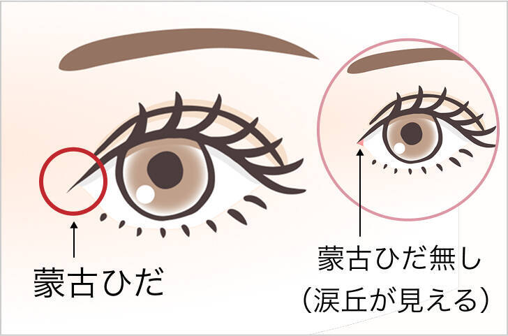 蒙古ひだとは、上まぶたから目頭部分にかけて張り出してる皮膚のことです。日本人は蒙古ひだが発達している人が多い傾向にあります。蒙古ひだを取り除くことで目の横幅が広くなったり、平行型の二重をつくりやすくなります。平行型二重をつくりたい方、離れ目が気になる方におすすめです。