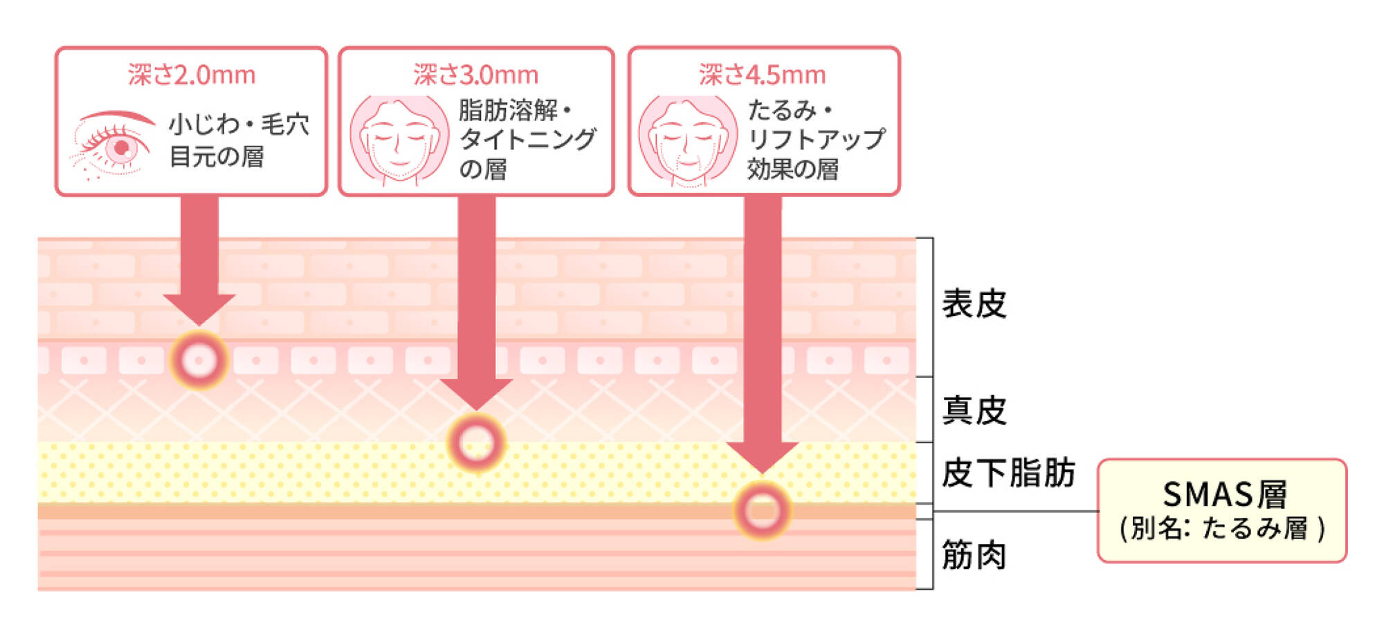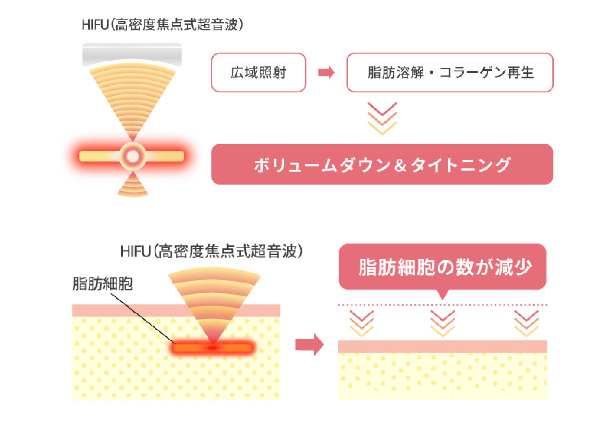 | 施術内容 | 超音波の熱エネルギーを照射し、小じわ、肌や皮下組織のたるみを改善、脂肪溶解作用により脂肪層のボリュームダウンを促します。 |